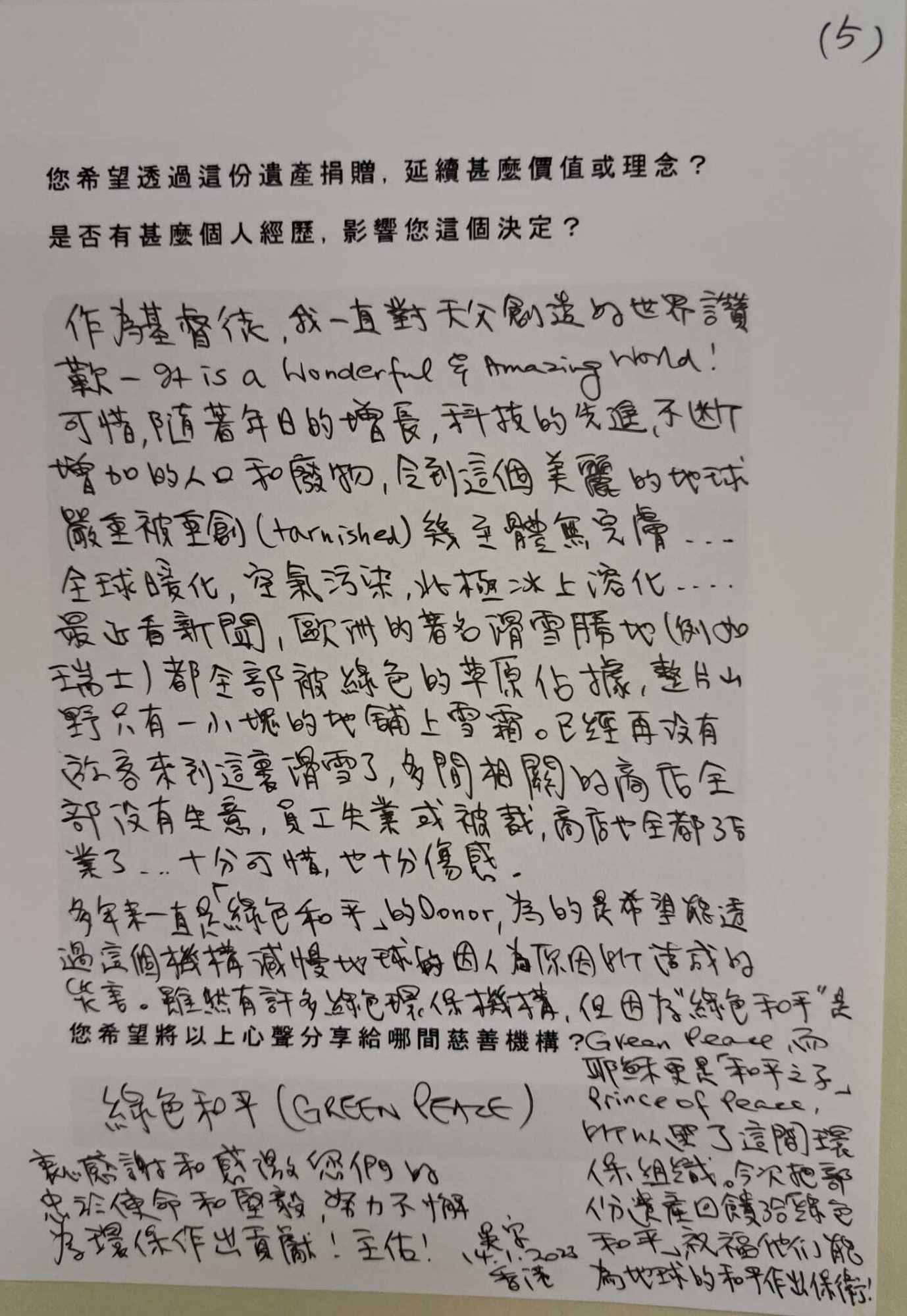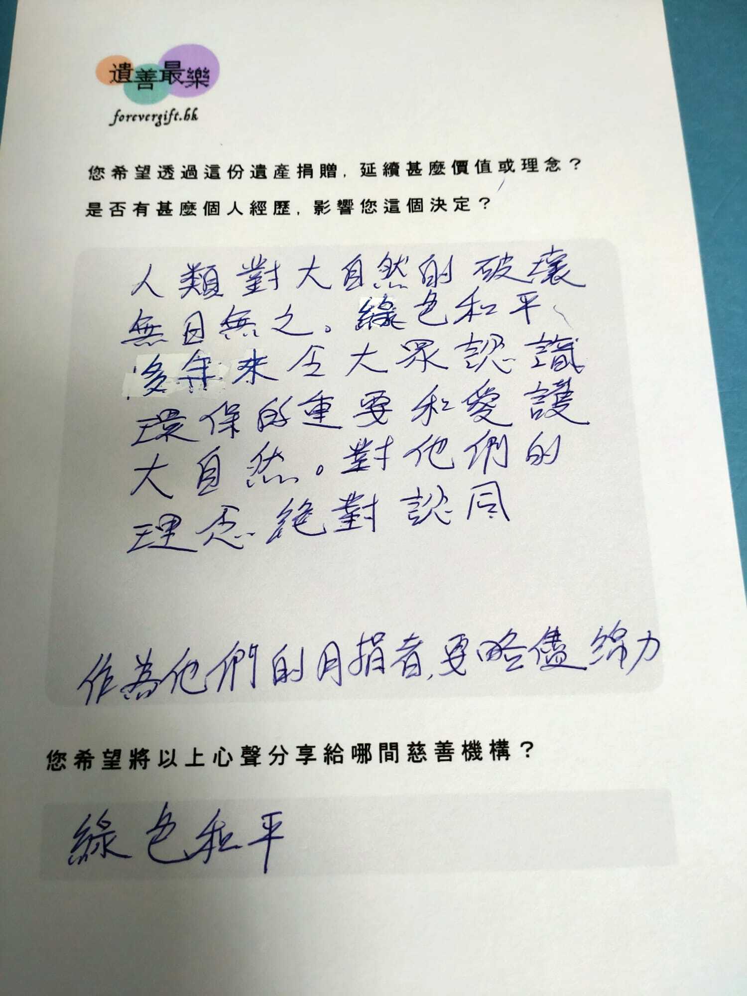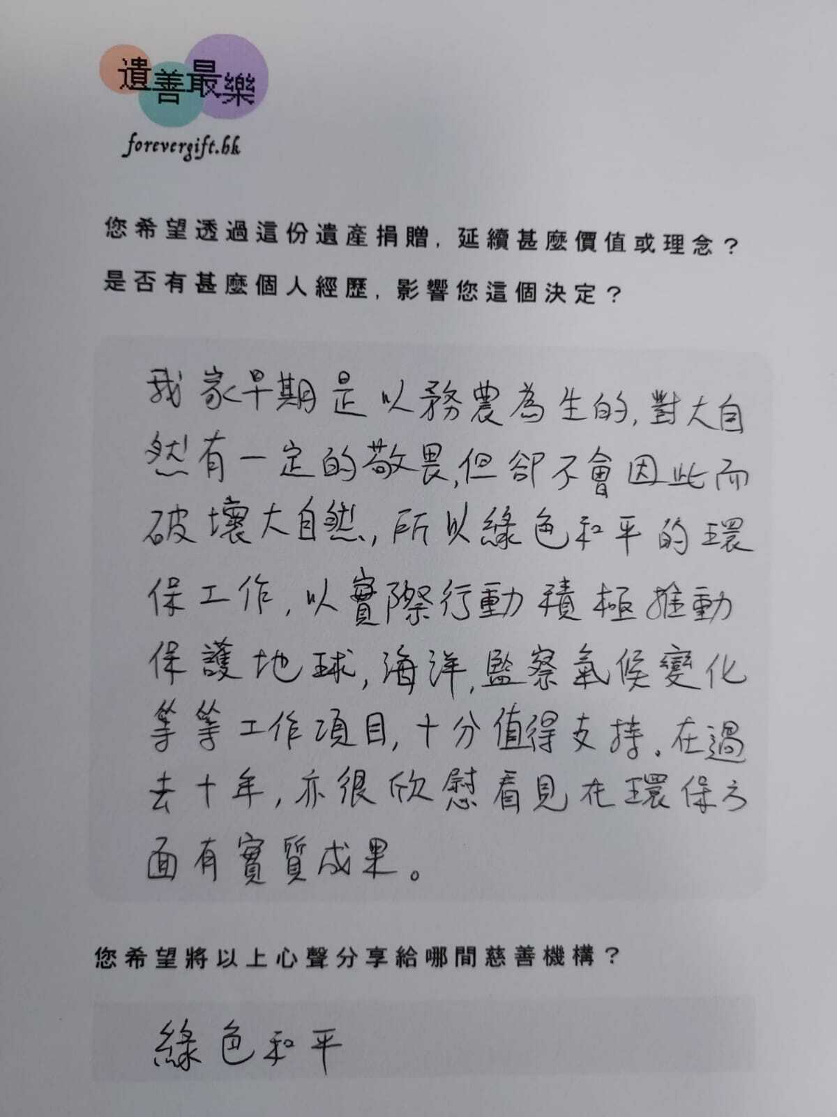 以下為綠色和平的註冊資料,以便您進行遺囑規劃或保險受益人設定時,可提供此完整資訊給您的律師或保險代理。若需要更多資訊,或有任何疑問,歡迎隨時與我們聯絡。