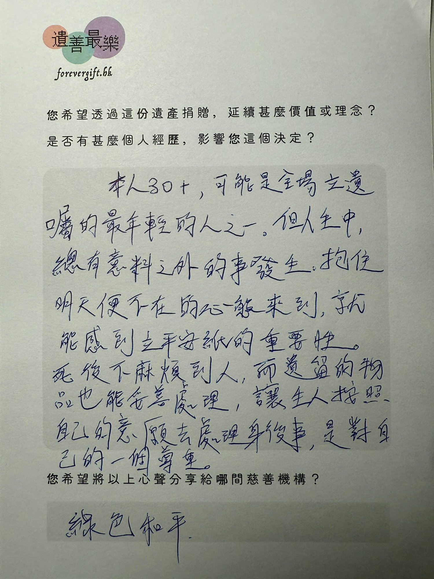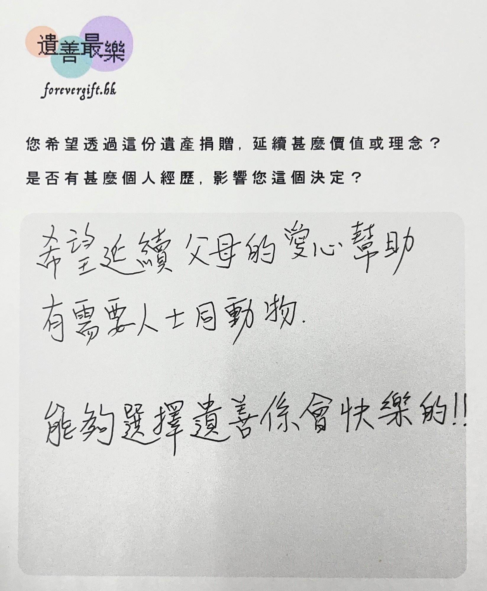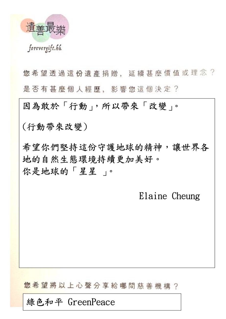 「百年樹人」Elaine透過遺善最樂訂立遺囑,希望藉遺贈的力量,保護一個充滿生機的地球,讓我們的後代,以至地球上所有生物和自然環境,可以繼續在美麗的地球村共存...